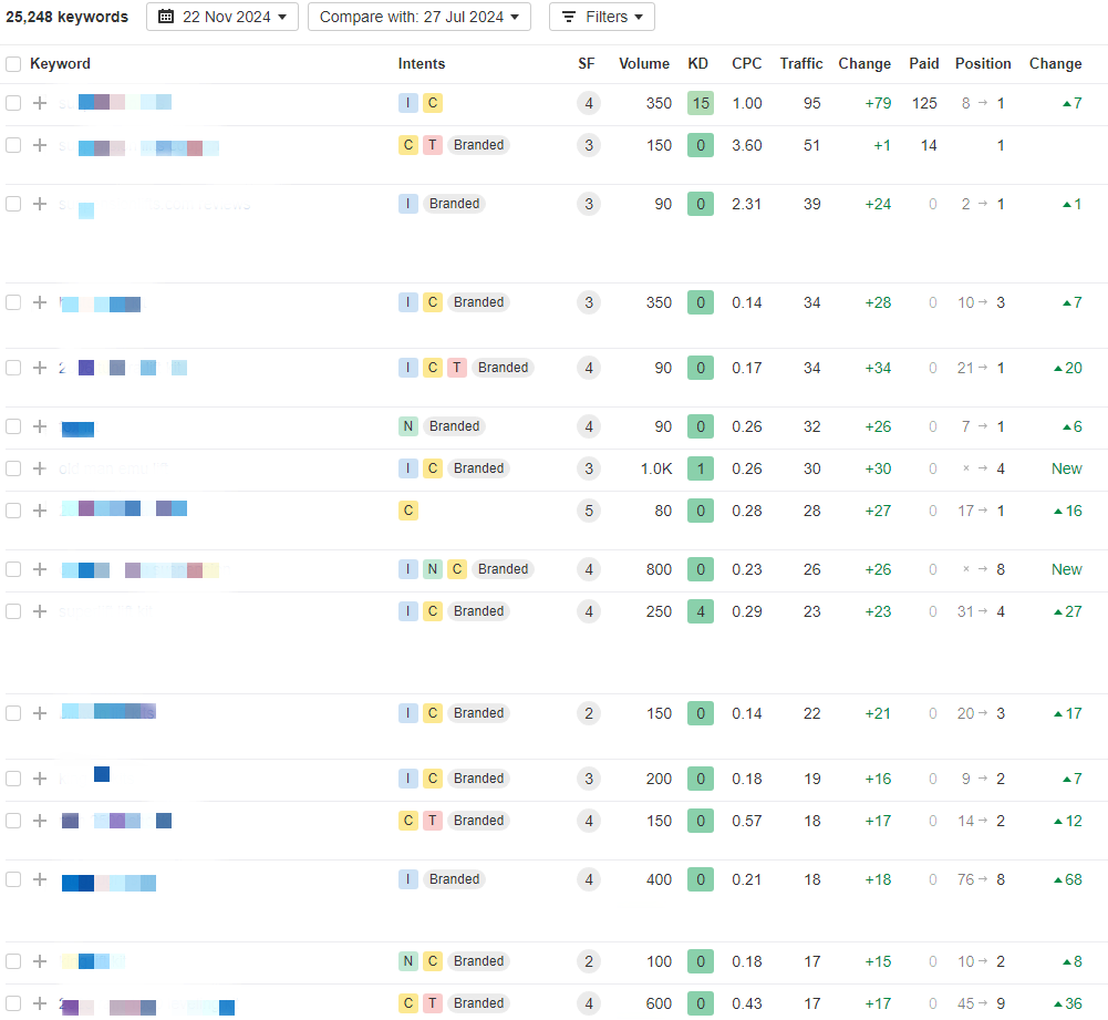 We have successfully started removing the site from Google filters, as evidenced by the improved positions and new keywords: