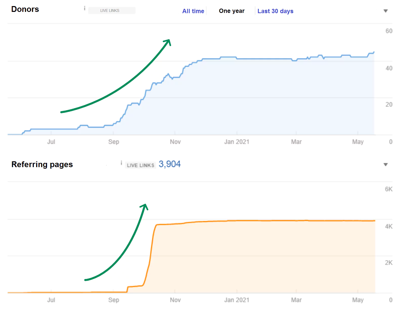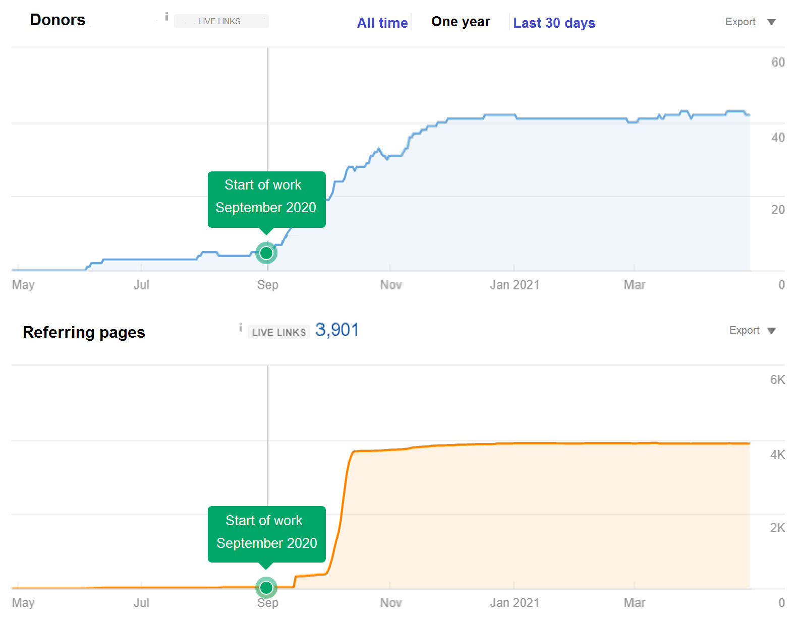 Growth of unique referring domains + set positive dynamics (data from Ahrefs)