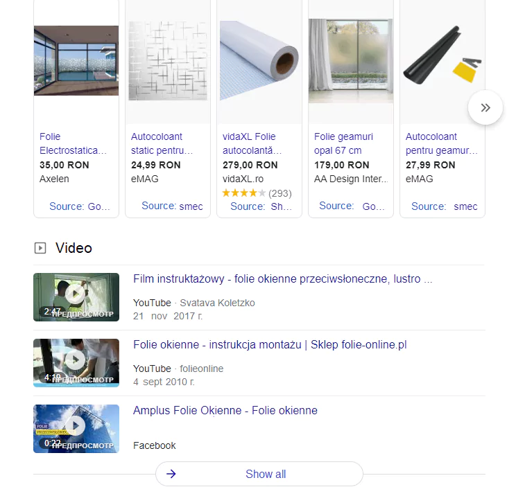 - Snippets in the search listings. Part of the search results for key queries is occupied by visual snippets from catalogs and thematic videos.